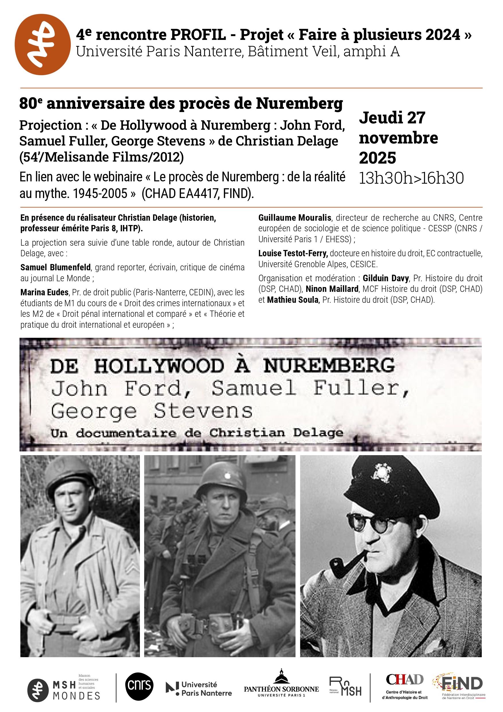 - Projection du documentaire : « De Hollywood à Nuremberg : John Ford, Samuel Fuller, George Stevens27 novembre 2025Dans le cadre des 80e anniversaire des procès de nuremberg, venez assister à la projection du documentaire "De Hollywood à Nuremberg" de Christian Delage, à l'Université Paris Nanterre La projection sera suivie d'un débat en présence du réalisateur. Lire la suite