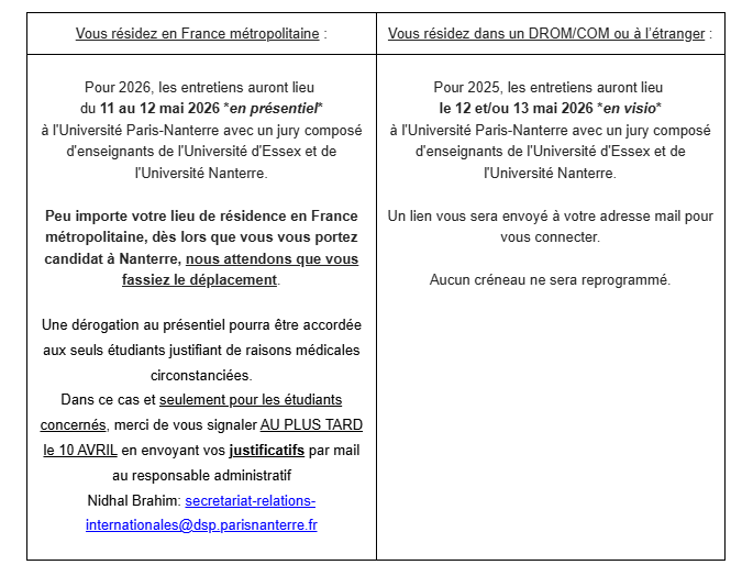 Selection Les 150 étudiants les mieux classés sur Parcoursup se verront proposer de prendre part à un entretien de sélection pour rejoindre la nouvelle promotion d'étudiants du double-diplôme en partenariat entre Nanterre et Essex.